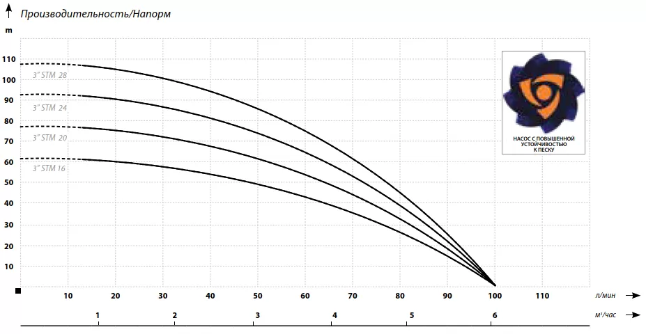 Многоступенчатые скважинный насосы диаметром 75 мм с повышенной устойчивостью к песку, рассчитанные на 3 и 4–дюймовые скважины. Насос IBO 3STM 28 обладает повышенной эффективностью к содержанию песка в перекачиваемой жидкости. Устойчивость к песку был достигнут благодаря использованию «плавающих лопастных колес» и выбору износостойких материалов. Скважинный насос IBO 3STM 28 обладает отменными характеристиками для насоса с небольшим диаметром. Максимальный напор насоса ИБО составляет 108 м, при этом максимальная производительность в пиковой точки показывает 6 м³/час. При таких напорно-расходных характеристиках мощность двигателя составляет всего 1500 Вт. Конденсатор насоса встроен в двигатель, благодаря чему электрическая установка намного проще, чем в случае насосов со стартовой коробкой. Насос оснащен тепловой защитой, установленной в обмотке двигателя. Насос комплектуется кабелем 1 м. Основным преимуществом насоса IBO 3STM 28 является чрезвычайно высокая производительность для насоса диаметром 75 мм со скоростью до 6 м³/час.