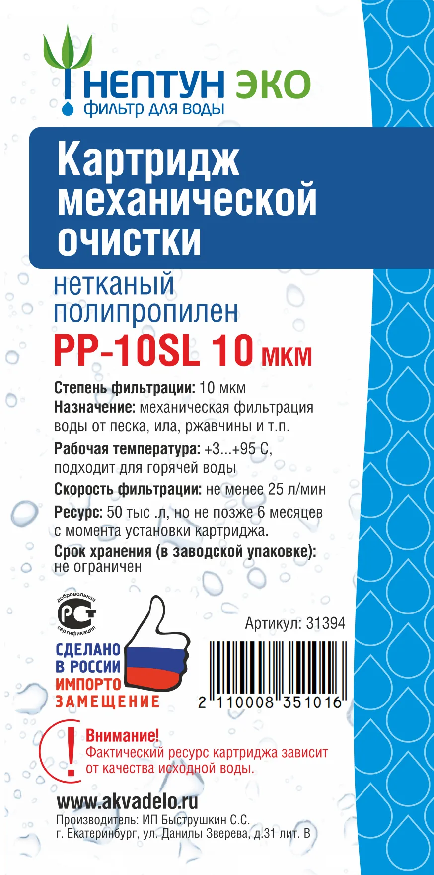 Высокая прочность: Особо прочный внутренний слой выдерживает высокое давление воды и предотвращает выброс частиц полипропилена в очищенную воду.