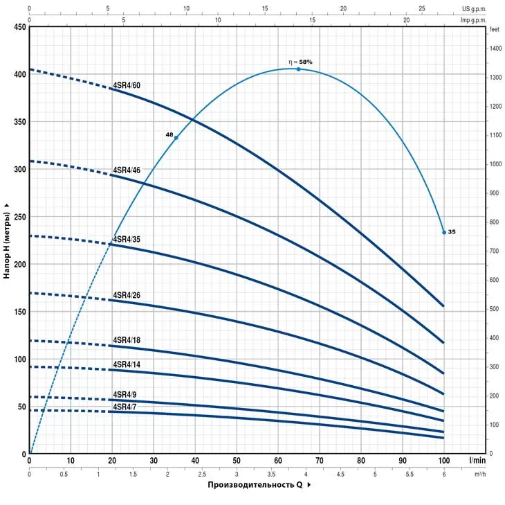 Глубинный насос Pedrollo 4SR4/46-P, отличается объективной ценой и надежной работой всех исполнительных механизмов. Насос Pedrollo 4SR4/46-P достаточно простой в эксплуатации и обслуживании, поэтому отлично подходит как для домашнего, так и промышленного применения.В основе работы Pedrollo 4SR4/46-P лежит конструктивно простой, но функционально успешный многоступенчатый центробежный принцип. Электрический двигатель подключается к агрегату через суппорт, в соответствии с нормативами международного стандарта NEMA. Мощность электродвигателя насоса составляет 4000 Вт . И при таких показателях мощности насос обладает максимальным напором в 308 метров и максимальной производительностью 6 м3/час. Функционирование Pedrollo 4SR4/46-P идентично большинству устройств, основанных на центробежных механизмах подачи воды. Жидкость втягивается в корпус устройства благодаря центробежной силе, создаваемой рабочими колесами, которые также проталкивают воду через все тело насоса "диаметр насоса 4"", а затем в нагнетающий патрубок "диаметр патрубка 1¼"", через который вода и попадает к конечному потребителю. Главной особенностью насоса Pedrollo 4SR4/46-P является малый диаметр корпуса агрегата, а также то, что перекачиваемая вода не касается стенок двигателя. Между жидкостью и корпусом движущей установки располагается прослойка из технологического масла, которая и предотвращает попадание мелких частиц непосредственно в исполнительный механизм. В то время как охлаждение электропривода происходит за счет верхнего способа забора воды, т.е. перекачиваемая жидкость находится всегда выше уровня расположения двигателя. Насос питается от сети в 380 в и комплектуется кабелем 1.5 метров.