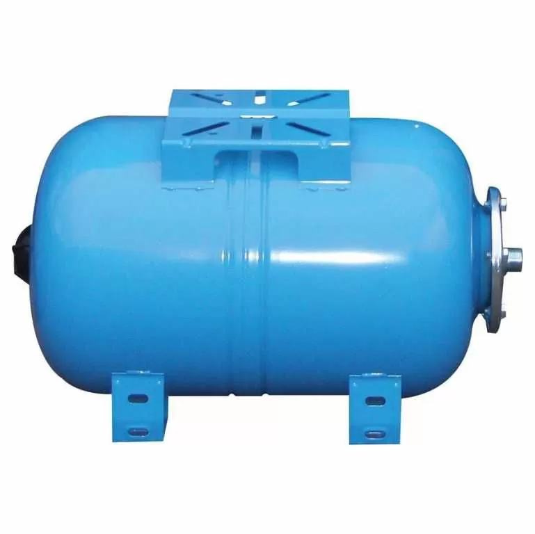 Гидроаккумулятор для воды WESTER WAO 150 горизонтального исполнения предназначен автоматизированных систем водоснабжения, повысительных установок и подпиточных устройств, установок пожаротушения и служат поддержания постоянного давления в системе, для предотвращения возникновения гидравлических ударов, а также позволяет сократить количество пусков насоса, тем самым продлевая срок службы насоса. Гидроаккумулятор представляет собой корпус из высококачественной стали, окрашенной в синий цвет, разделенный сменной мембранной на две камеры: водяную и воздушную. В воздушной камере находится предварительно закаченный воздух. Контакт воды с металлической поверхностью корпуса невозможен, так как вода поступает в водяную камеру мембраны, изготовленной из высококачественного материала EPDM (материал обладает благоприятными механическими свойствами и очень широким температурным диапазоном применения). Гидроаккумуляторы WESTER WAO оснащены устойчивыми опорными ножками у основания бака. Благодаря специальной площадке для установки насоса на поверхности бака, гидроаккумуляторы WAO могут использоваться с поверхностными насосами.